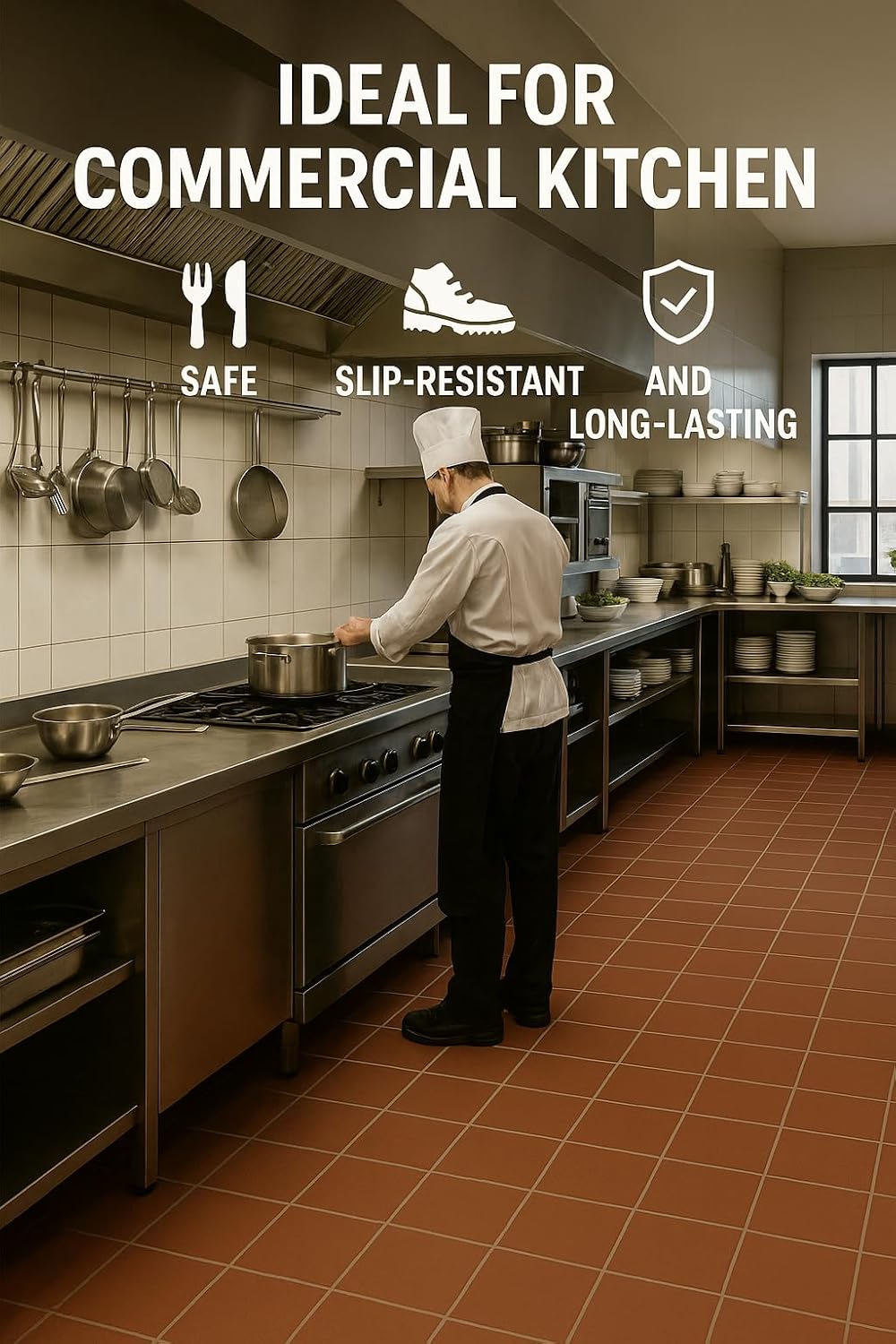 6x6 Red Quarry Tile, expertly engineered for commercial and industrial applications. Whether you're outfitting a restaurant kitchen, retail floor, school, warehouse, or factory space, these tiles offer unmatched durability, slip resistance, and long-term performance in even the most demanding environments.Crafted from natural shale and clay and fired at extremely high temperatures, our red quarry tiles are designed to withstand heavy foot traffic, spills, grease, and harsh cleaning chemicals. The rich terracotta-red tone adds a timeless and professional look to both indoor and outdoor spaces, making it a favorite choice among contractors, architects, and commercial builders.Tile Size: 6 inches x 6 inches (nominal) Material: Natural Quarry (Fired Clay) Finish: Unglazed with a textured surface for enhanced grip Color: Deep Quarry Red (Earthy, Industrial Aesthetic)Thickness: Approximately 0.38 inch Application Areas:Commercial kitchens.Restaurant dining areas.Retail stores.Entryways and corridors.Outdoor patios and walkways.Manufacturing and industrial floors.The consistent sizing of these tiles ensures a straightforward installation, whether using thin-set mortar or mud bed techniques. They're compatible with a variety of grout colors and can be sealed for additional stain resistance. Once installed, they are simple to maintain with commercial-grade cleaners—no waxing or polishing required.The natural red hue masks stains and wear, while the unglazed, slip-resistant surface provides excellent traction—even when wet or greasy. Perfect for meeting OSHA safety standards in food service and high-traffic environments.Unlike porcelain or glazed ceramic tiles, quarry tile is extremely impact-resistant, making it a go-to option for spaces where dropped tools, carts, and equipment are common.This tile is 50% more slip resistant when compared to ordinary tile that has a DCOF less than or equal to 0.42
