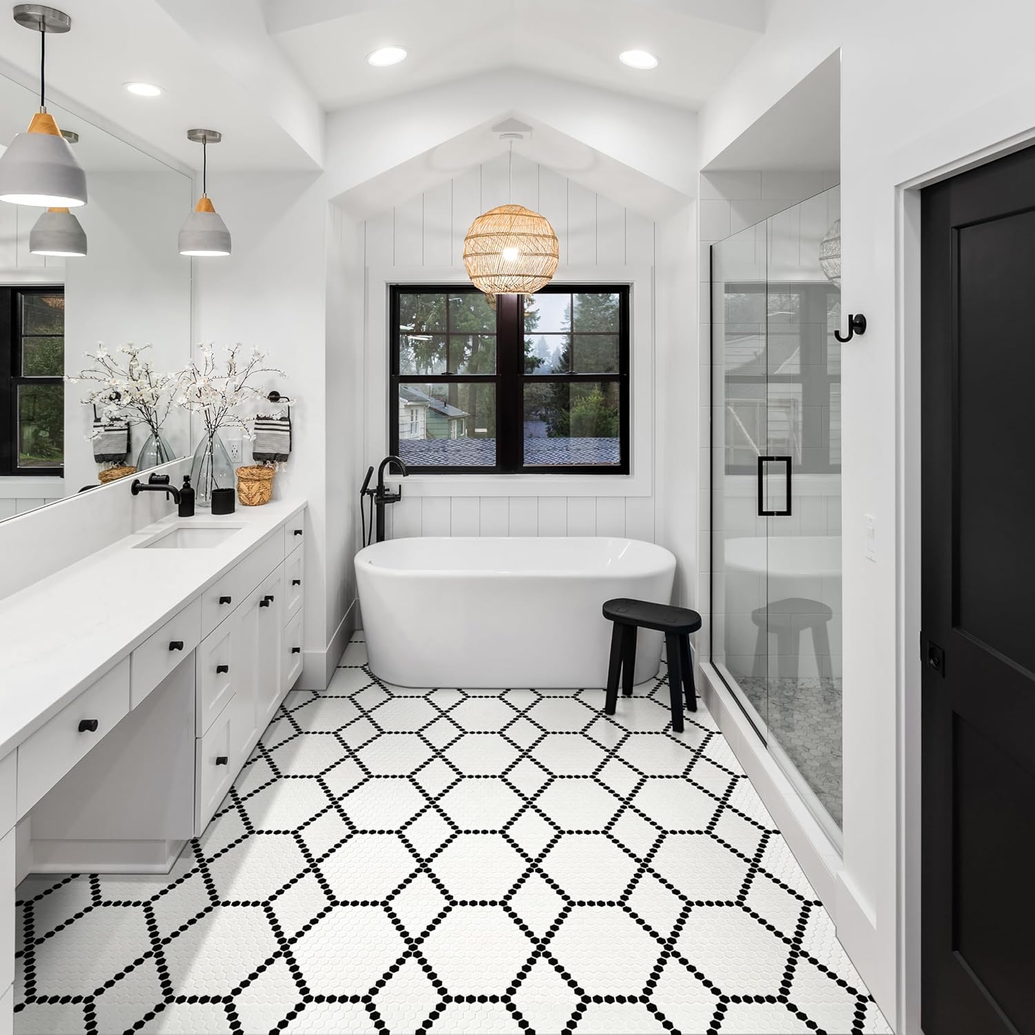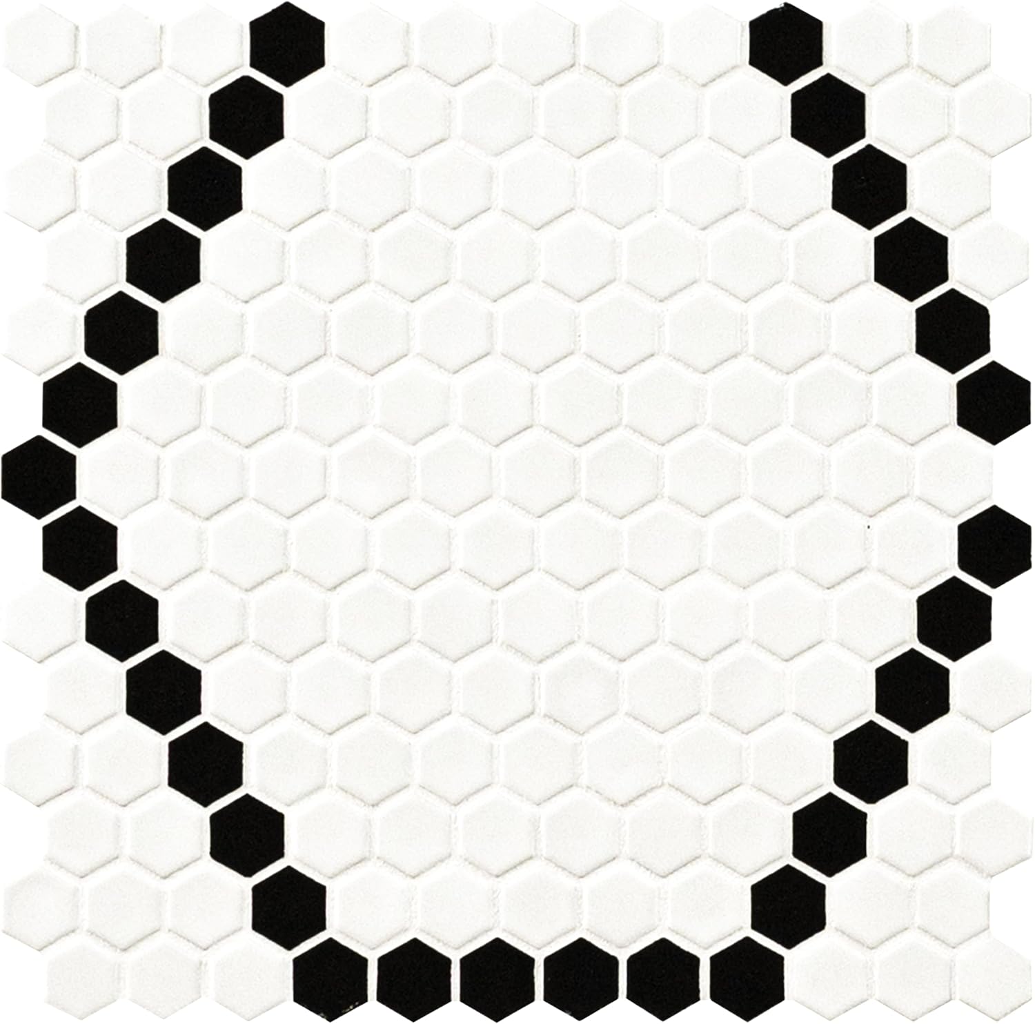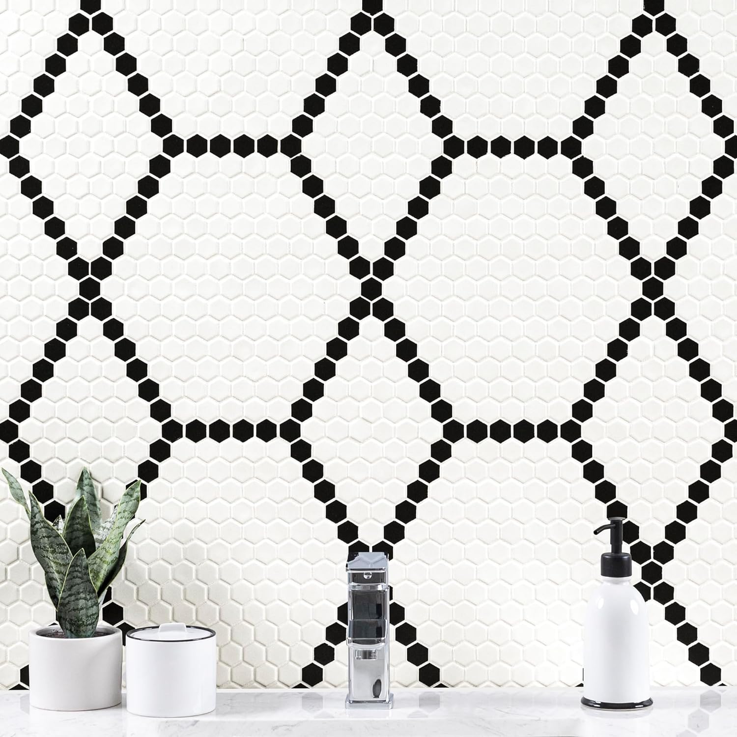 Elevate the charm in your space with the captivating White & Black Hive Pattern Tile. These 1” hexagon tiles boast an alluring hive-like design, featuring white tiles in the center and black tiles along the edges, accentuated by a matte finish. Equipped with a convenient mesh backing, these mosaics effortlessly streamline the installation process. Whether you desire a stylish backsplash, eye-catching accent wall, or a rejuvenated residential floor, these remarkable porcelain tiles flawlessly blend traditional and contemporary aesthetics. Immerse your space in an enchanting world of elegance and refinement as you adorn it with these exquisite tiles.